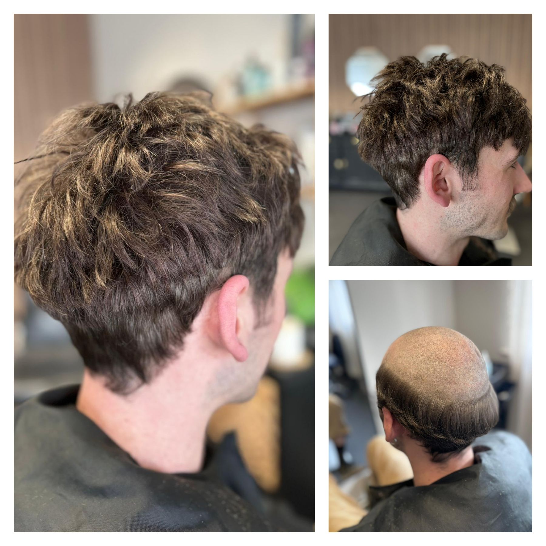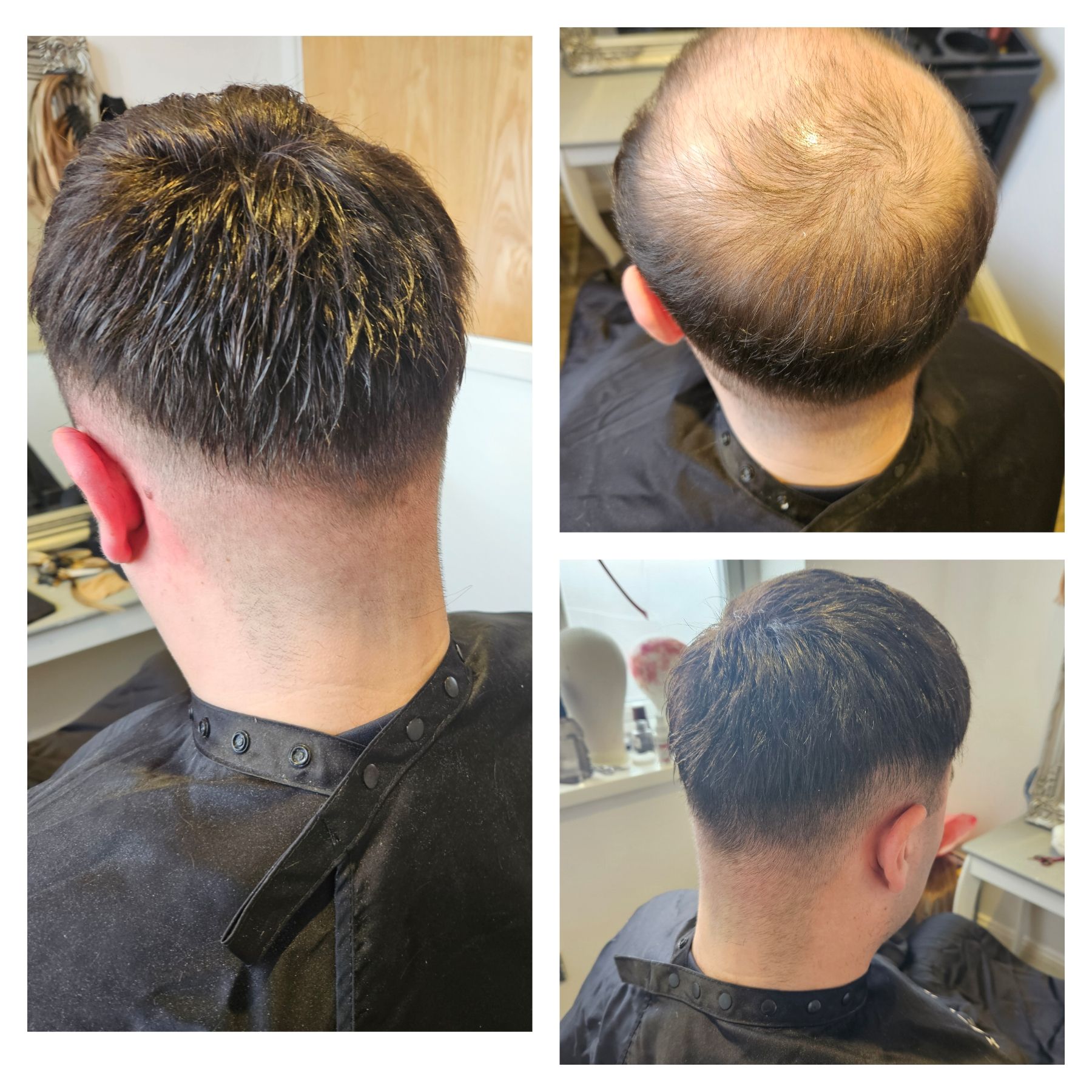 I offer a non surgical men's hair replacement systems. A thin transparent skin like material acts like a second layer of skin. This layer is implanted with human hair that matches your own hair colour. The system is glued or taped to your scalp and the hair is cut to your desired style and blended with your own hair.